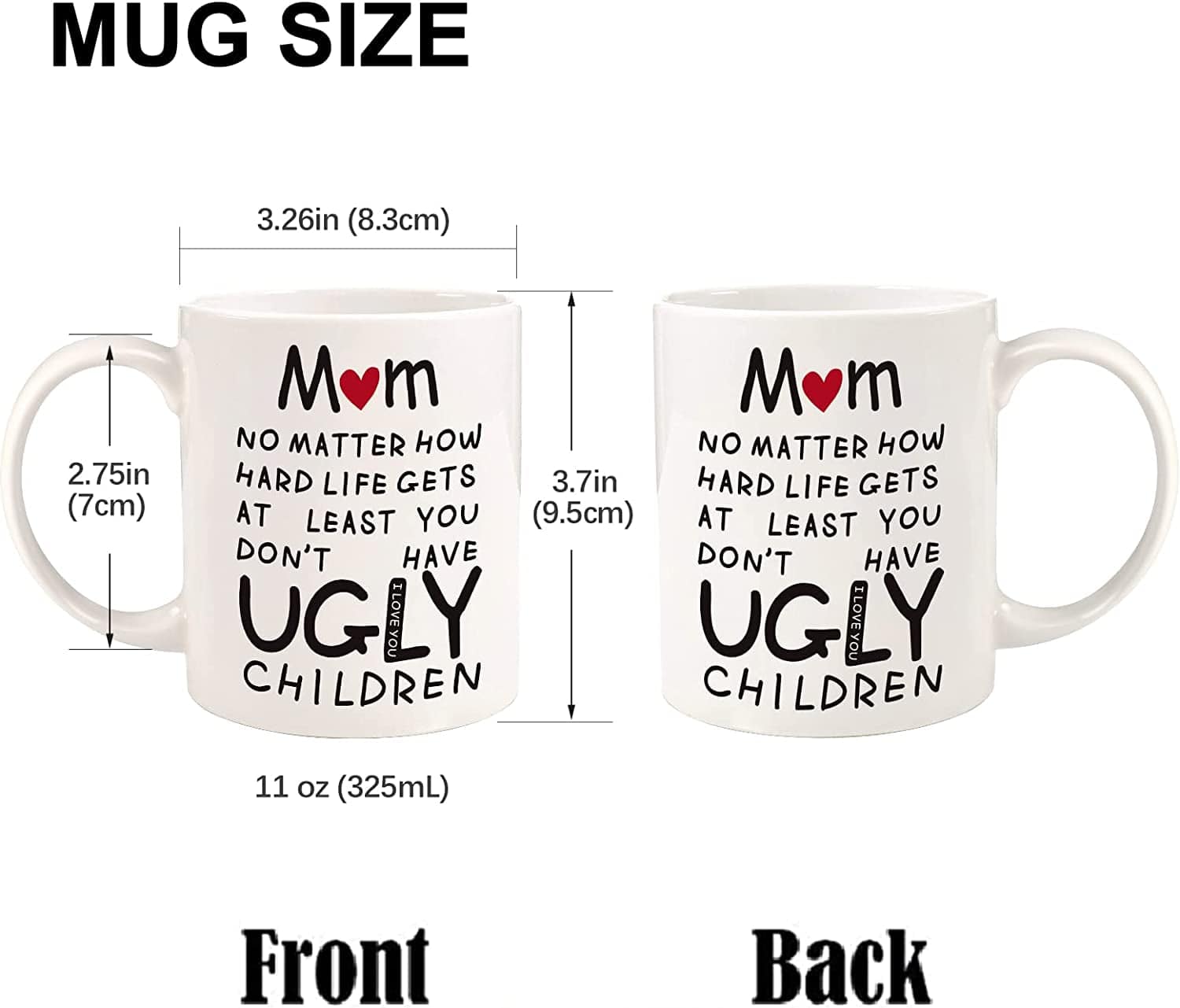 Brighten your mom's day with a dash of humor and a whole lot of love with this delightful coffee mug! It's not just a mug; it's a daily reminder of the joy and laughter she brings to your life. Featuring the witty phrase "Mom, no matter how hard life gets, at least you don't have ugly children," this mug is guaranteed to bring a smile to her face with every sip.