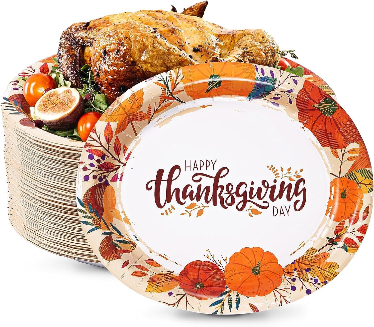 - 🥂PREMIUM QUALITY🥂 The oval paper plates are made of 100% premium paper. They are firm, stable and not easy to bend, fold or tear and strong enough, to deliver a high quality hold for the largest helpings,to fully set down the Thanksgiving turkey or large slice of pie, and will match well with other Thanksgiving tableware to add a pop of color to your harvest thanksgiving party decor.