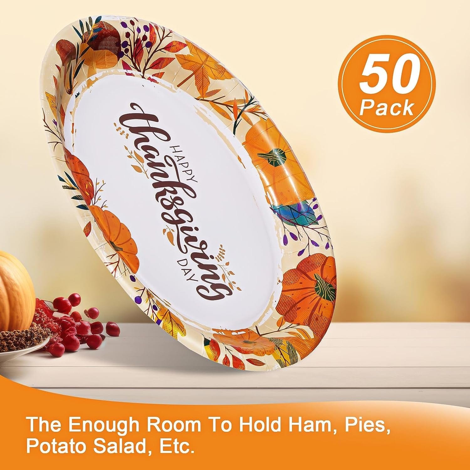50 Count Thanksgiving Oval Paper Plates, 10" X 12.5" Autumn Fall Harvest Party Supply Thanksgiving Decor