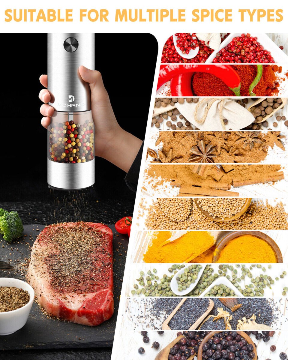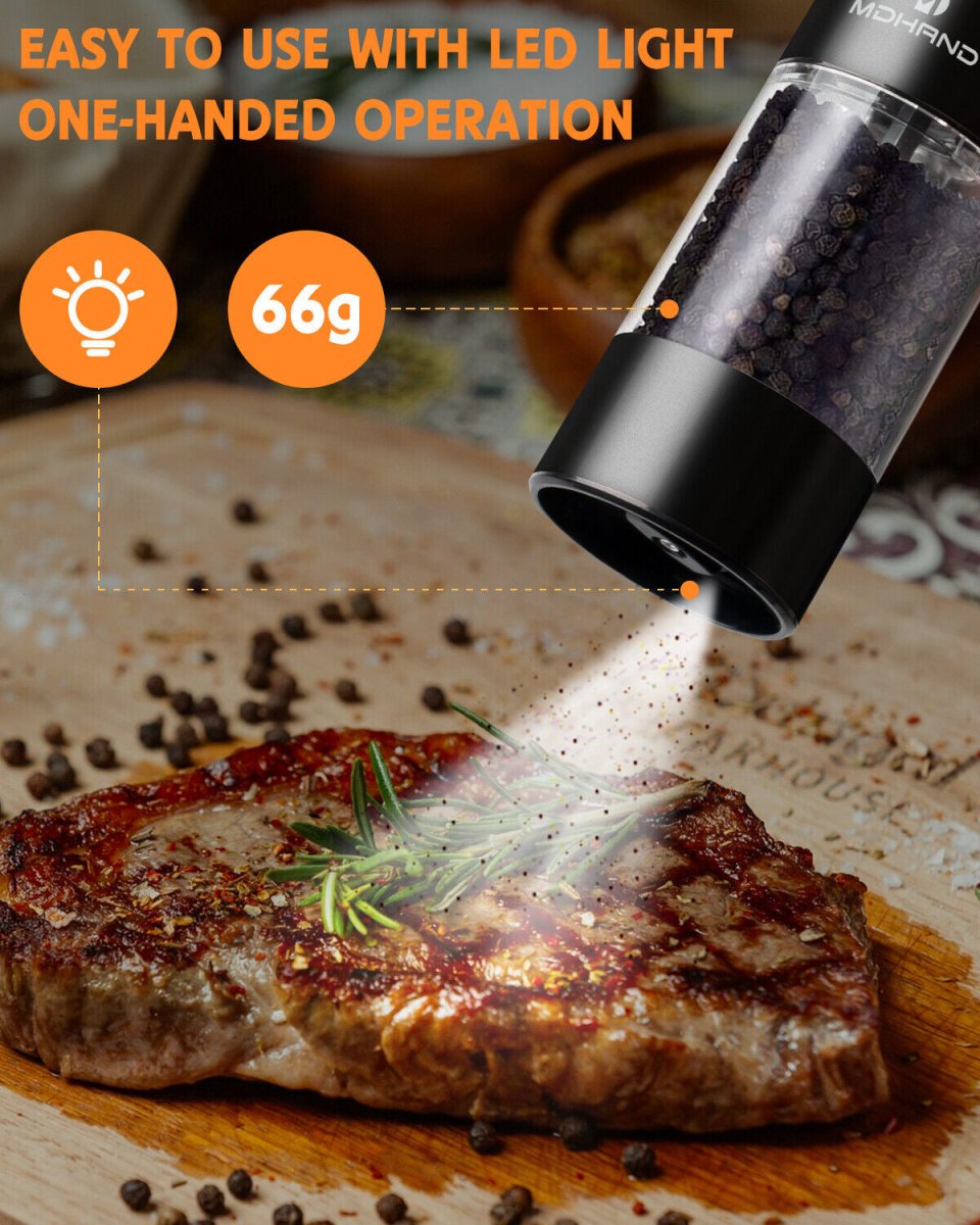 One-Hand & Automatic Operation: Simplify your cooking with our one-handed electric salt and pepper grinder set. A single press of a button is all it takes to operate, freeing up your other hand for multitasking and making your cooking experience more efficient and enjoyable.