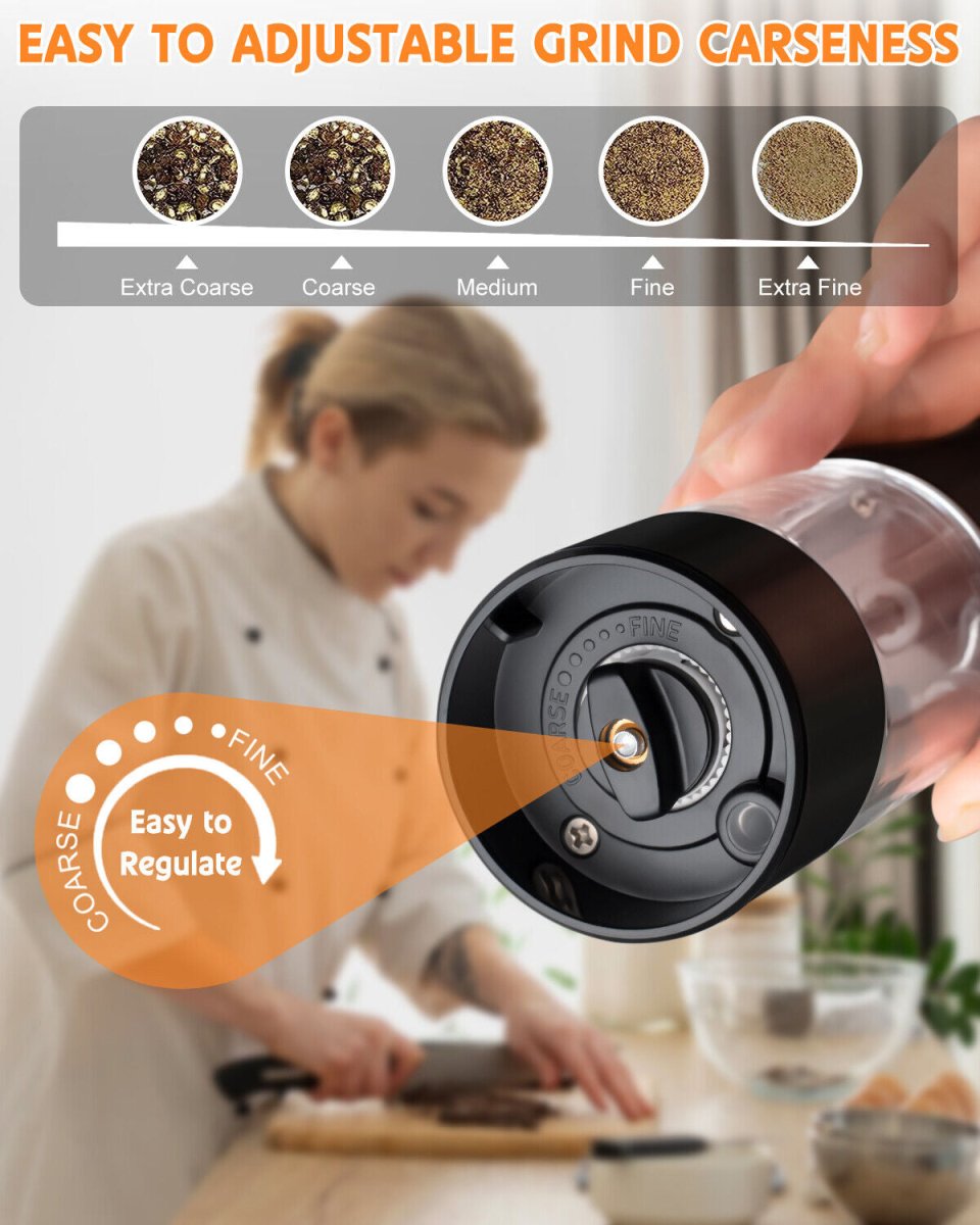 Adjustable Coarseness Electric Pepper Grinder: Experience the convenience of freshly ground spices with our upgraded electric pepper grinder. Featuring an adjustable ceramic grinder, you can easily control the coarseness of your spices by turning the top of the device. Rotate clockwise for fine particles and counterclockwise for a coarser grind.