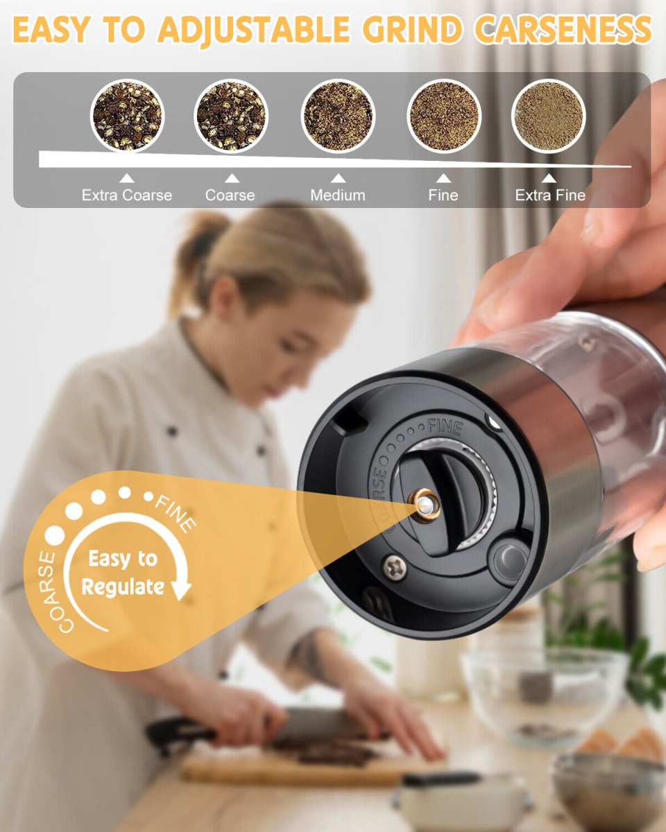 Adjustable Coarseness & Ceramic Mill Core: The grinder features a coarseness adjustment knob for precise control, with two ceramic grinding cores that are durable, wear-resistant, and rust-free, ensuring long-lasting sharpness.